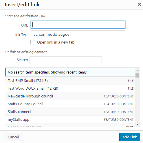 To add a link to other content within your pages, first select the text you want to become a link, then click on the link button (the chain icon). This will show a small link window: