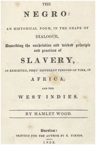"The Negro : an Historical Poem in the Shape of Dialogue Describing the Unchristian and Wicked Principle and Practices of Slavery as Exhibited Through Different Periods of Time in Africa and the West Indies" by Hamlet Wood, 30 Mar 1833. Published by R Timmis, Burslem, Staffordshire, 1833.