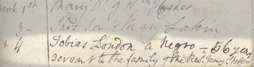 Penkridge St Michael and All Angels baptism and burial register, burial : 4 Mar 1787 "Tobias London a Negro - 56 years, servant to the family of Rev James Stafford"