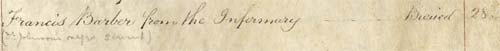 Register of baptisms and burials, Stafford St Mary, burial : "28 January 1801 Francis Barber, servant to Dr Johnson"