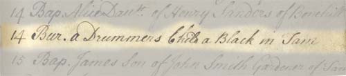 Tamworth St Editha general register, burial : 14 March 1741 "a Drummer's child, a Black in Tam[worth]"