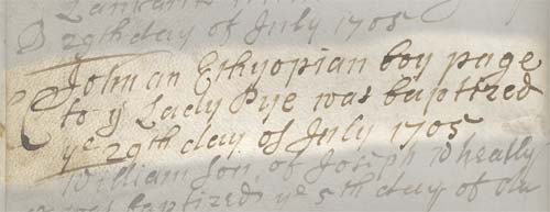 Tipton St Martin general register, baptism : 29 July 1705 "John, an Ethyopian boy, page to the Lady Pye"