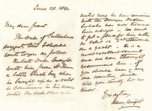 Letters from Henry Wright to Mr Grant re Charlie, former inhabitant of St Thomas, Danish West Indies (now U.S. Virgin Islands), and former valet/ship's steward to the 3rd Duke of Sutherland, 28 Jun and 13 Jul 1894