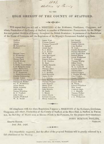 Notice by the Sheriff to the noblemen, gentlemen, clergy and freeholders of Staffordshire to attend a meeting for the gradual abolition of slavery in the British dominions, following a petition (petitioners' names listed), 1826