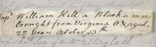 Rocester St Michael baptism register : 13 October 1776 "William Hill a Black-a-moor, brought from Virginia and aged 22 years"