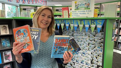 Sue Ball stood next to the Summer Reading Challenge book stand