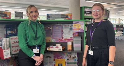 (L-R) Eloise Rylance and Keira Taylor photographed next to the sanitary product collection and donation point at Stafford Library.