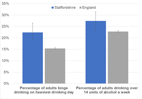 - In Staffordshire, 27.4% of adults drink more than the recommended 14 units of alcohol a week, higher than national of 22.8% (Health Survey for England).