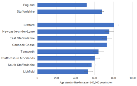 - Nearly all (7) of Staffordshire’s districts have rates higher than the national average.