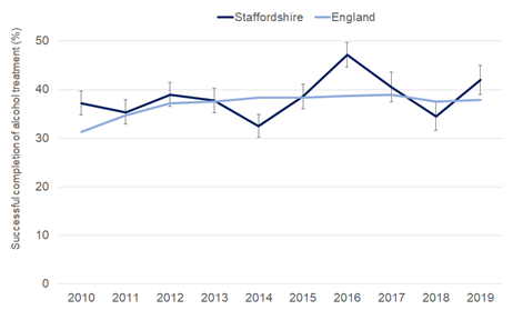 - Successful completion of alcohol treatment is used as the key proxy measure of recovery, with improvements seen in Staffordshire - 42% of alcohol users successfully completed treatment, above national and represents an improved picture from 2018 (34%).