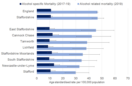 Rates of alcohol related mortality are highest in East Staffordshire and alcohol specific mortality highest in Newcastle.