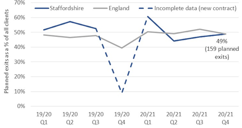 - Planned exits from treatment remained at about half of all clients exiting treatment during 2019/20 and 2020/21 – similar to national.