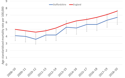 - In Staffordshire, there are on average 55 deaths per year related to drug poisoning. In line with national trends, the rate of mortality (6.7 per 100,000) has increased locally and remains similar to national.