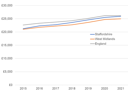 - Whilst average annual earnings are lower than national, they have been some improvement, increasing by 2% since last year. However, there are still more Staffordshire residents in lower paid, manual & routine jobs compared to national. Lowest income levels are in East Staffordshire and Tamworth; some of the areas that also experience health issues such as lower life expectancy and higher rates of mental health emergency admissions.