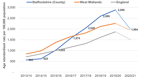 - More recent unpublished data shows that Staffordshire obesity related hospital admissions fell during 2020/21 to 1,994 per 100,000. This mirrored a general fall in hospital admissions due to Covid-19 and Staffordshire remains higher than national.