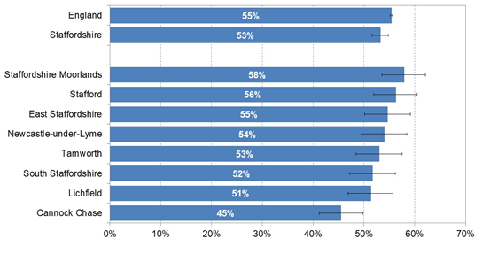 - A lower than average proportion of adults eat 5 portions of fruit and veg a day (53% and 2nd worst of our similar authorities). This ranges from 58% in Staffordshire Moorlands to 45% in Cannock Chase.