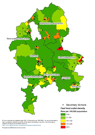 - Whilst the density of fast food outlets (2017) in Staffordshire is similar to national, there are high concentrations in town centres and areas of deprivation - Cannock Chase and East Staffordshire have a higher than average density.