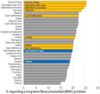 - Staffordshire residents have a higher than average (22%) self reported Musculoskeletal condition. Staffordshire districts make up five of the six highest authorities.