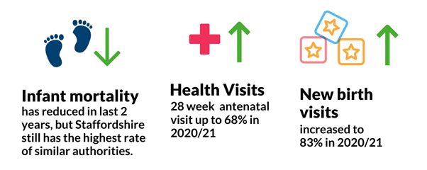• Infant mortality rates have reduced in last 2 years, and now closer to national. Despite improvements, Staffordshire still has the highest rate amongst similar authorities.