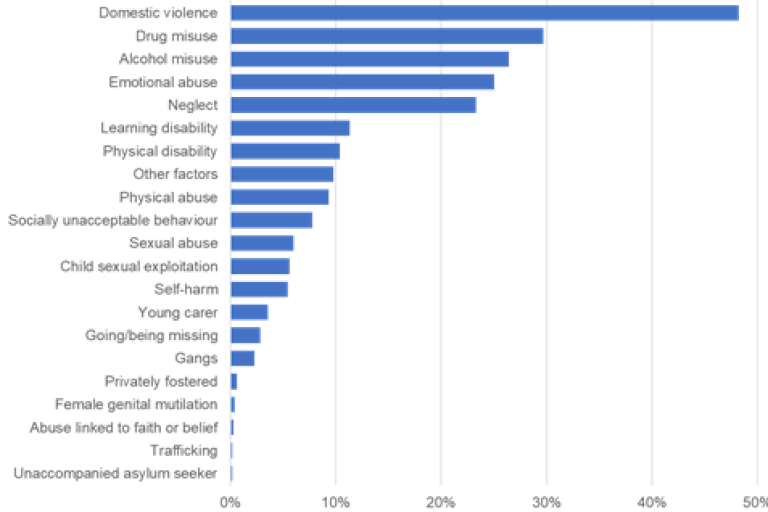- Risk factors identified during children's social care assessments provide an insight into potential vulnerabilities. This helps us to target early intervention and prevention - in Staffordshire the top four factors relate to: mental health, domestic violence and substance misuse (drugs and alcohol).