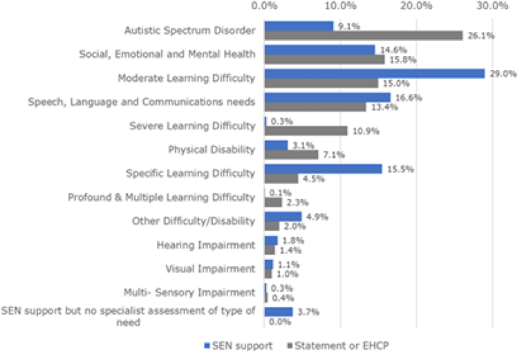 - Autistic Spectrum Disorders (ASD) are the most common primary need for those with EHCPs, both in Staffordshire (26%) and nationally (31%).