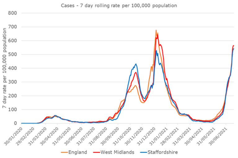 - By 19 July 2021, nearly 73,800 people in Staffordshire had tested positive for COVID-19 and over 2,350 people had died.