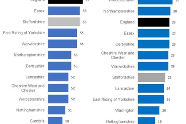 - However, performance falls by year 11, with Staffordshire’s attainment lower than national and the lowest among similar authorities – only 37% achieve a 9-5 pass in English and Maths.