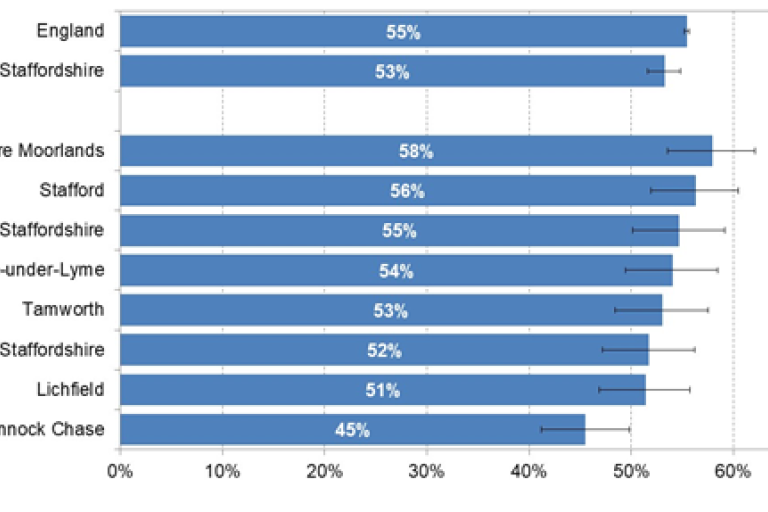 - A lower than average proportion of adults eat 5 portions of fruit and veg a day (53% and 2nd worst of our similar authorities). This ranges from 58% in Staffordshire Moorlands to 45% in Cannock Chase.