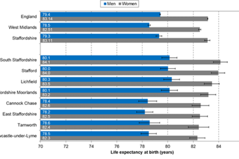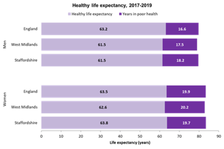 - Healthy life expectancy in Staffordshire is nearly 62 years for men and 64 years for women – both have fallen by 1.8 years and 1.1 years respectively.