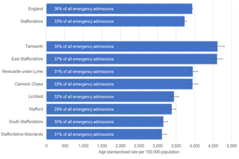 - Staffordshire also has the 5th highest rate among similar authorities for emergency admissions for intentional self-harm (all ages). Newcastle, Stafford and Cannock Chase among the highest in the West Midlands.