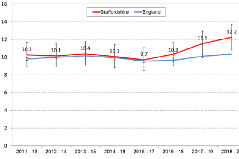 There are nearly 95 suicides in Staffordshire each year, with rates of suicide rising to 12.2 per 100,000 (2018-20) and higher than national (10.4 per 100,000).