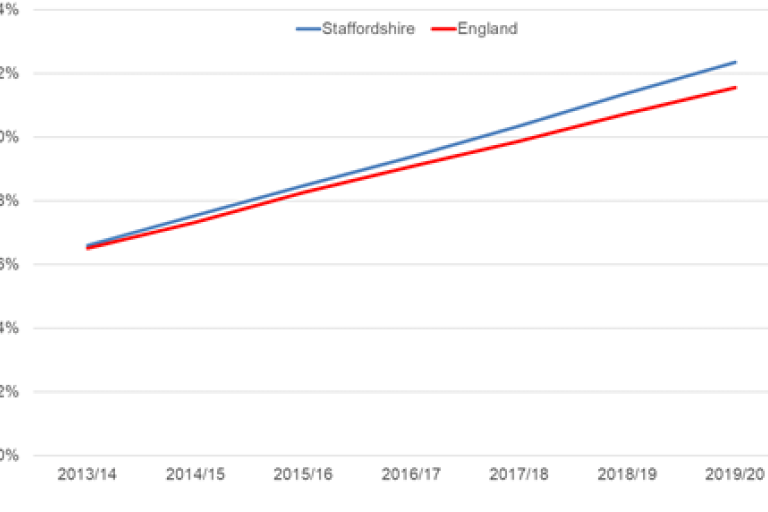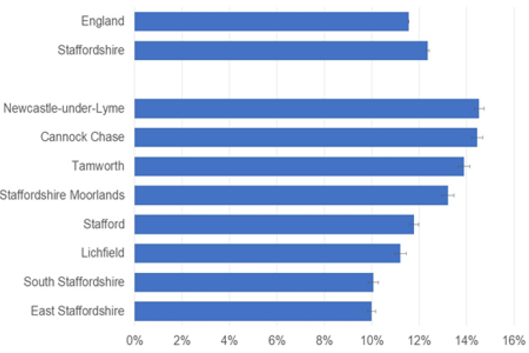 - GP recorded depression (12%) in Staffordshire adults continues to increase – a trend that has doubled since 2012/13 and is higher than national.