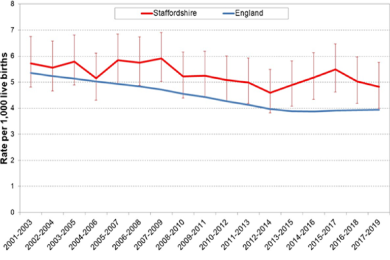 - Only East Staffordshire (6.2 per 1,000 births) has rates worse than England and is 10th worst in the country.